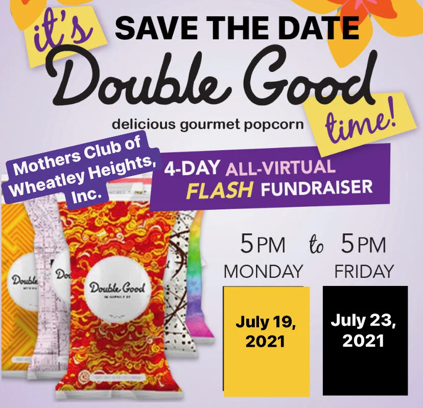 The Mothers Club of Wheatley Heights will be having a Double Good virtual fundraiser! It's 100% contactless, we keep 50% of the profit and the product ships directly to the buyer. Our fundraising window begins on July 19, 2021 @5pm and ends July 23, 2021 @5pm. Prices range from$18- $59. The popcorn is award winning and delicious.